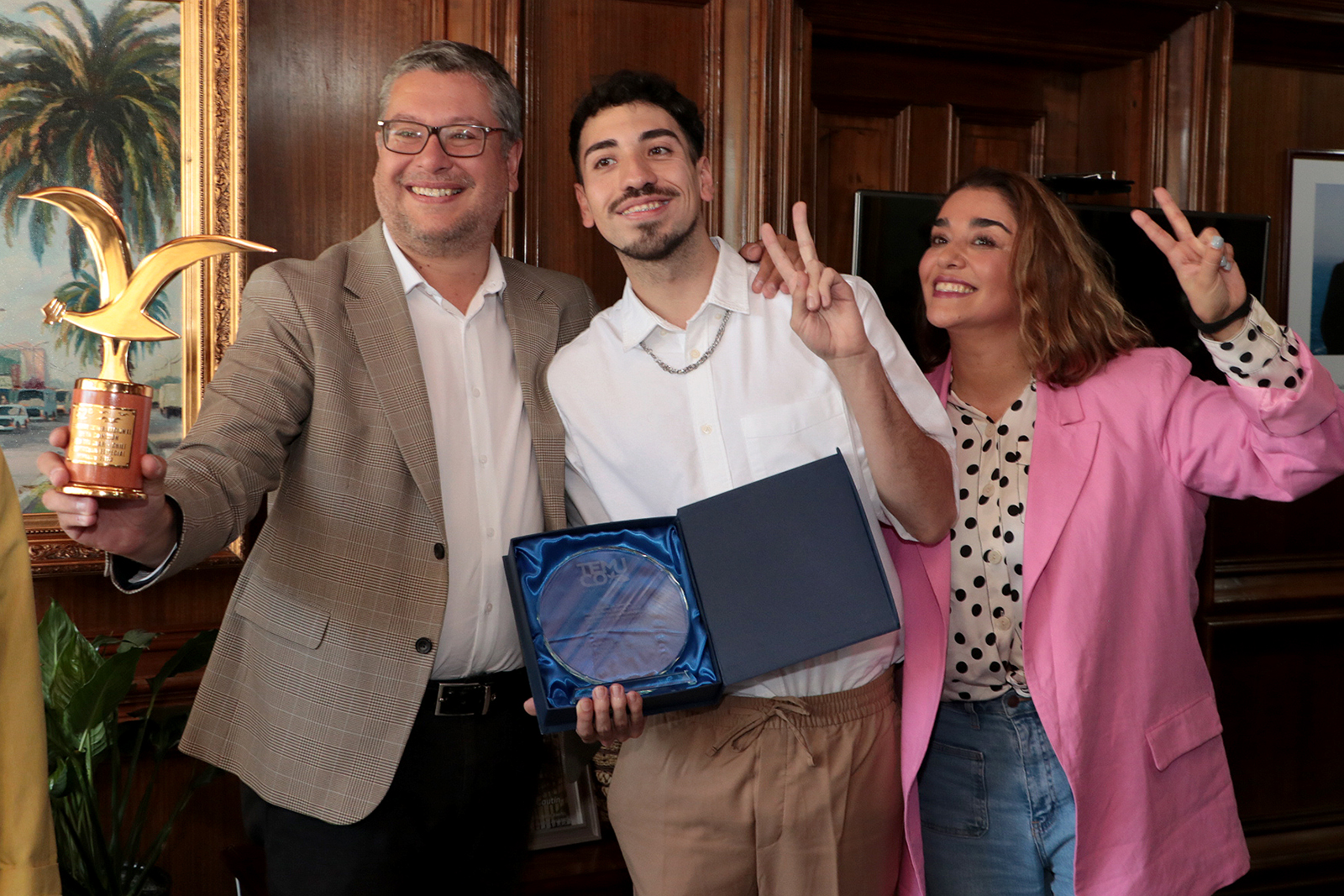 Entre risas y alegría, Diego Urrutia llegó hasta la Municipalidad de Temuco junto a familiares para recibir este importante reconocimiento tras su triunfo en el festival de Viña del Mar, con gaviota de oro en mano el artista fue recibido por la máxima autoridad comunal junto a la concejala Claudia Peñailillo.
