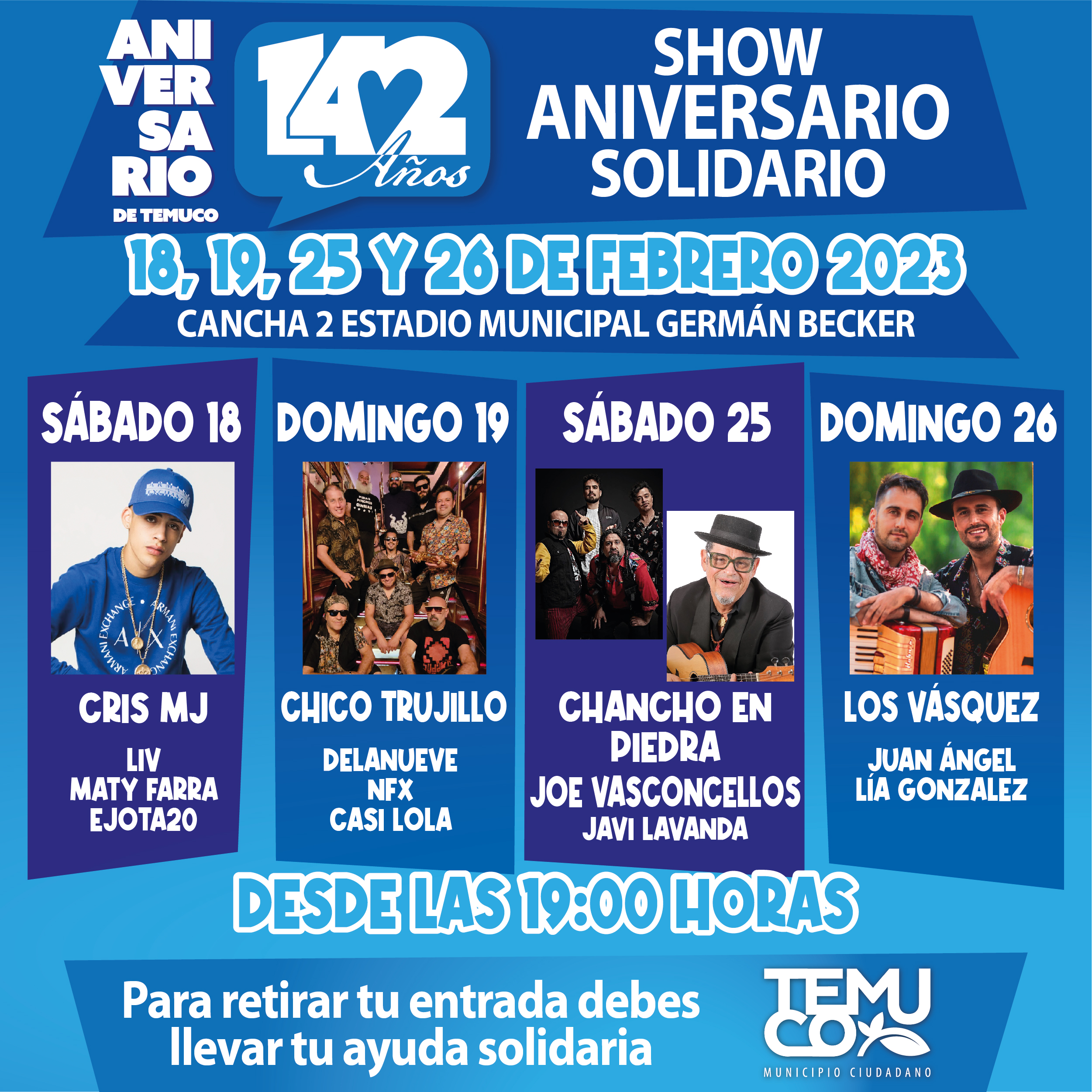 Cris mj, los Vásquez y Chico Trujillo serán parte de la parrilla del show aniversario de este año en la capital regional de La Araucanía, ocasión que contará con cuatro jornadas de solidaridad para que así los temuquenses puedan disfrutar de los 142 años de la comuna.