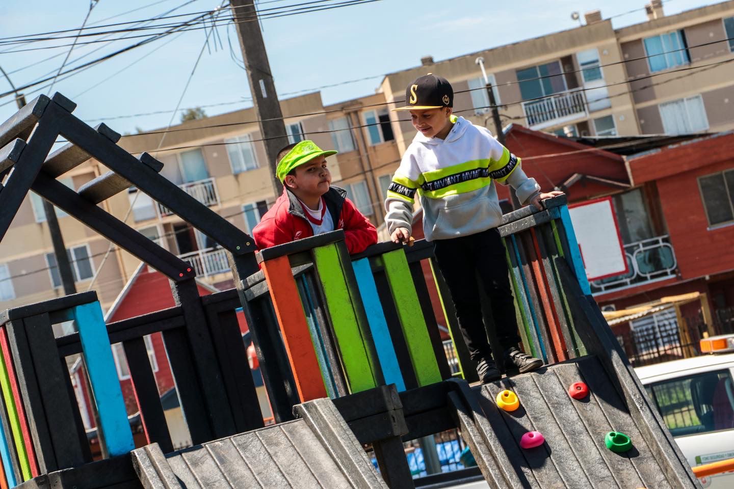 El mobiliario que se instaló consiste en 2 juegos con tobogán, hechos de madera plástica con intervenciones de plástico y teñido, columpio de madera plástica, con placas de acero, 4 bancas de madera plástica con perfiles de acero donados por aseo y ornato, 4 basureros de madera plástica.