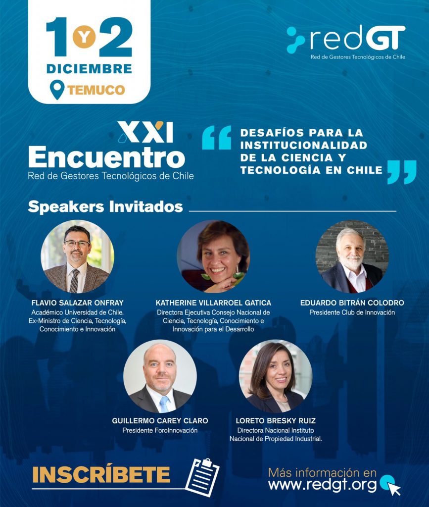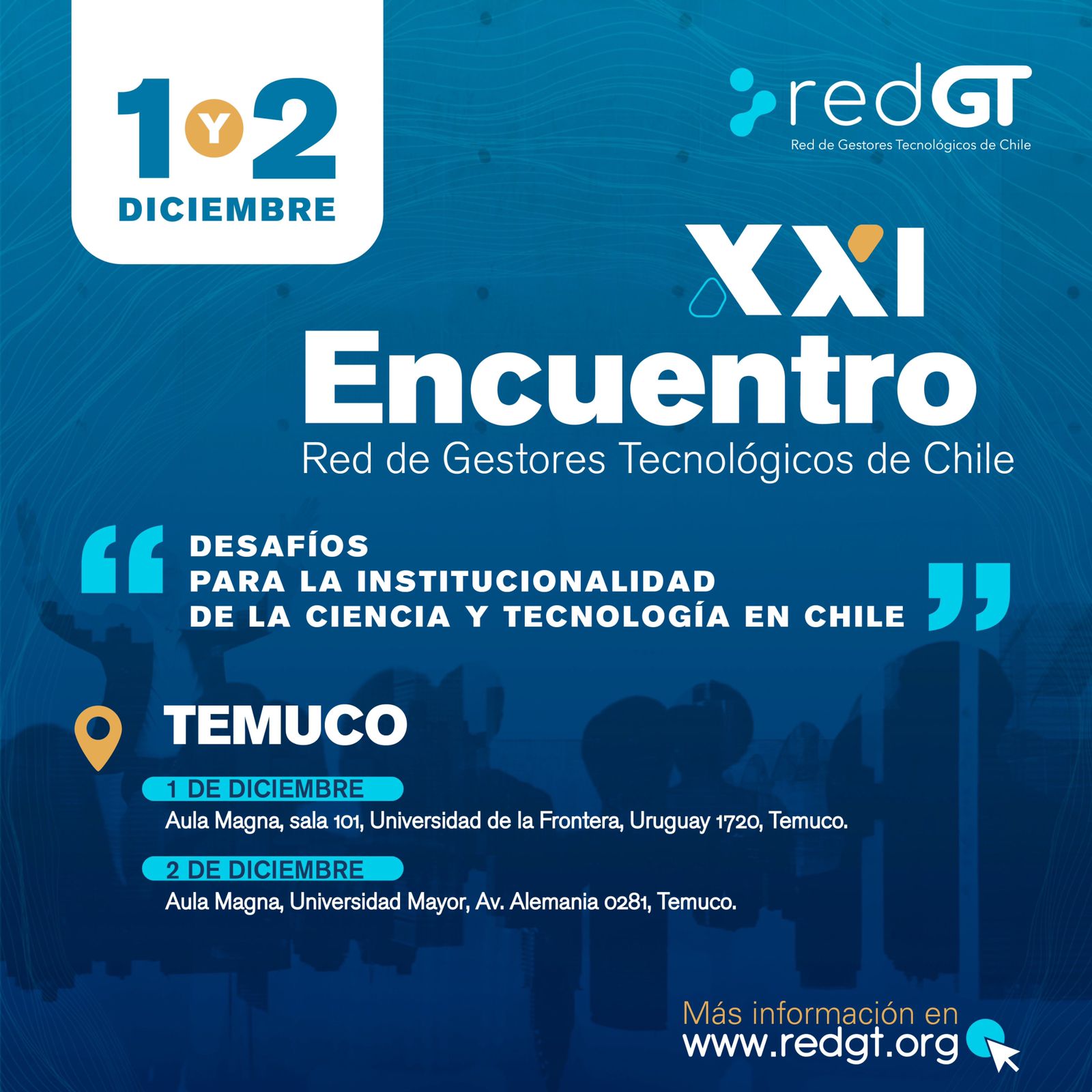 El Aula Magna de la Universidad de La Frontera albergará la primera jornada del XXI del Encuentro de la Red de Gestores Tecnológicos de Chile- RedGT, evento de carácter nacional que se realizará este 1 y 2 de diciembre en Temuco.