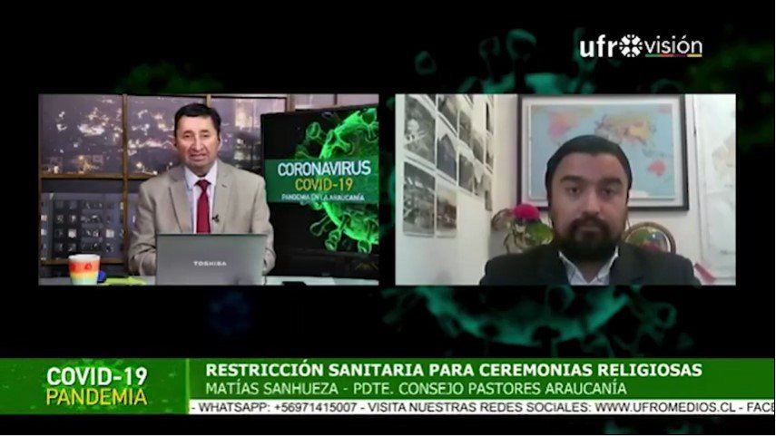 El presidente del Consejo de Pastores de La Araucanía, Matías Sanhueza, en entrevista con Ufrovisión, entregó detalles sobre la resolución que permite el desarrollo de actividades religiosas en lugares abiertos con un aforo de 20 personas y un máximo de 10 en espacios cerrados a partir de la Fase 2.